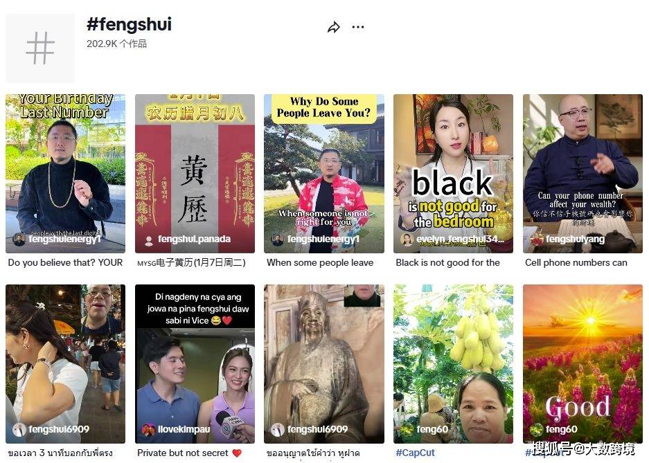 大数跨境(观察,Tik Tok上#fengshui标签在TikTok有20.29万条作品,超21亿次曝光,风水、玄学正逐渐受到老外的喜爱与追捧。
