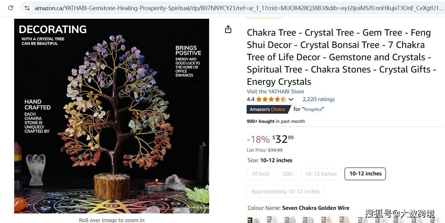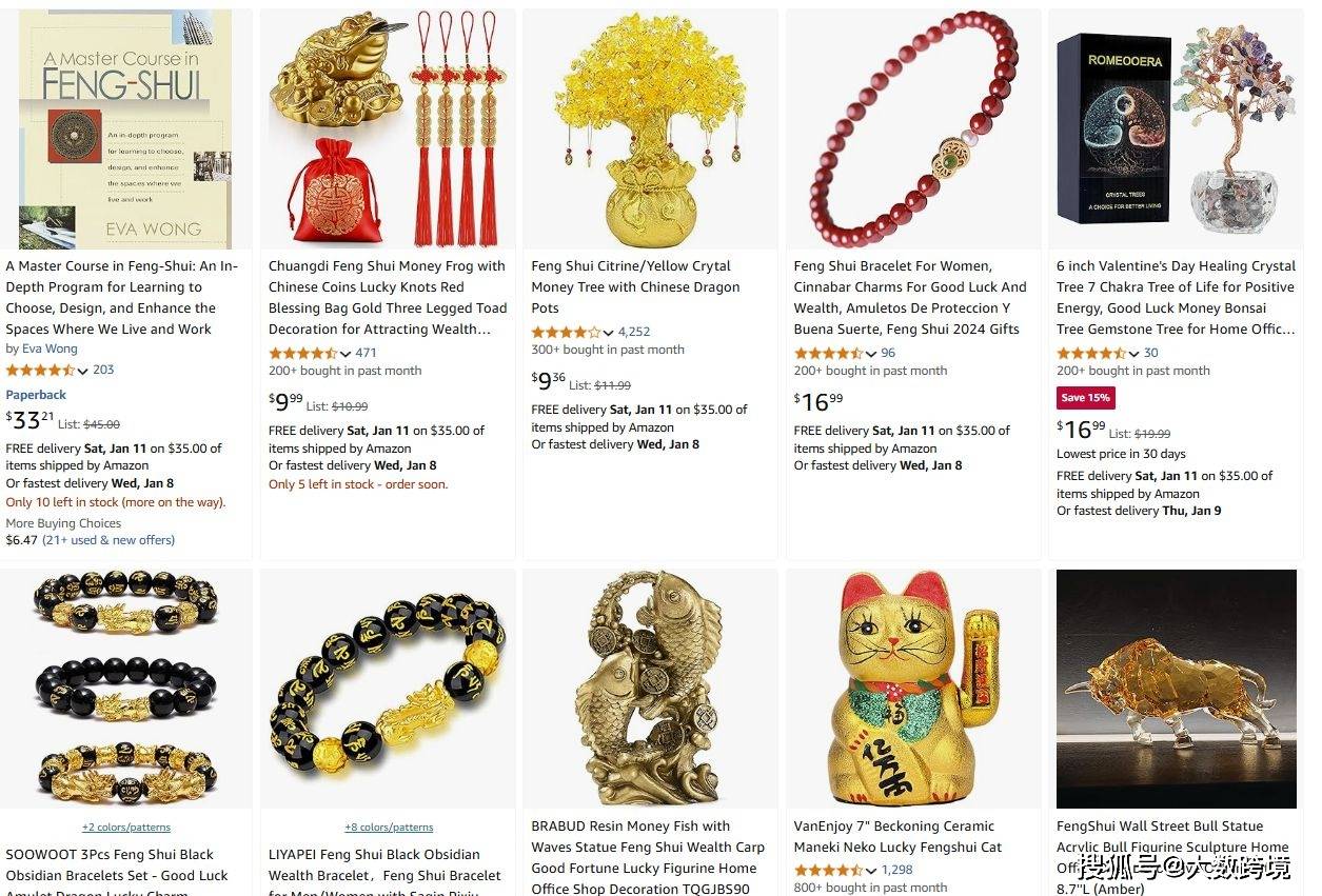 在Amazon上搜索“fengshui”,宝石树、能量水晶、风水罗盘、运势手串、招财植物盆栽、好运铃铛、风水挂饰等产品销量可观。